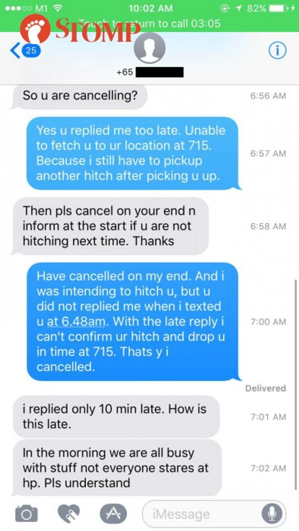 Patricia explained and replied: "I accepted the Hitch at 6.35am and you told me that you had to reach the destination by 7am. I cancelled at 6.36am. How is that advanced?"
