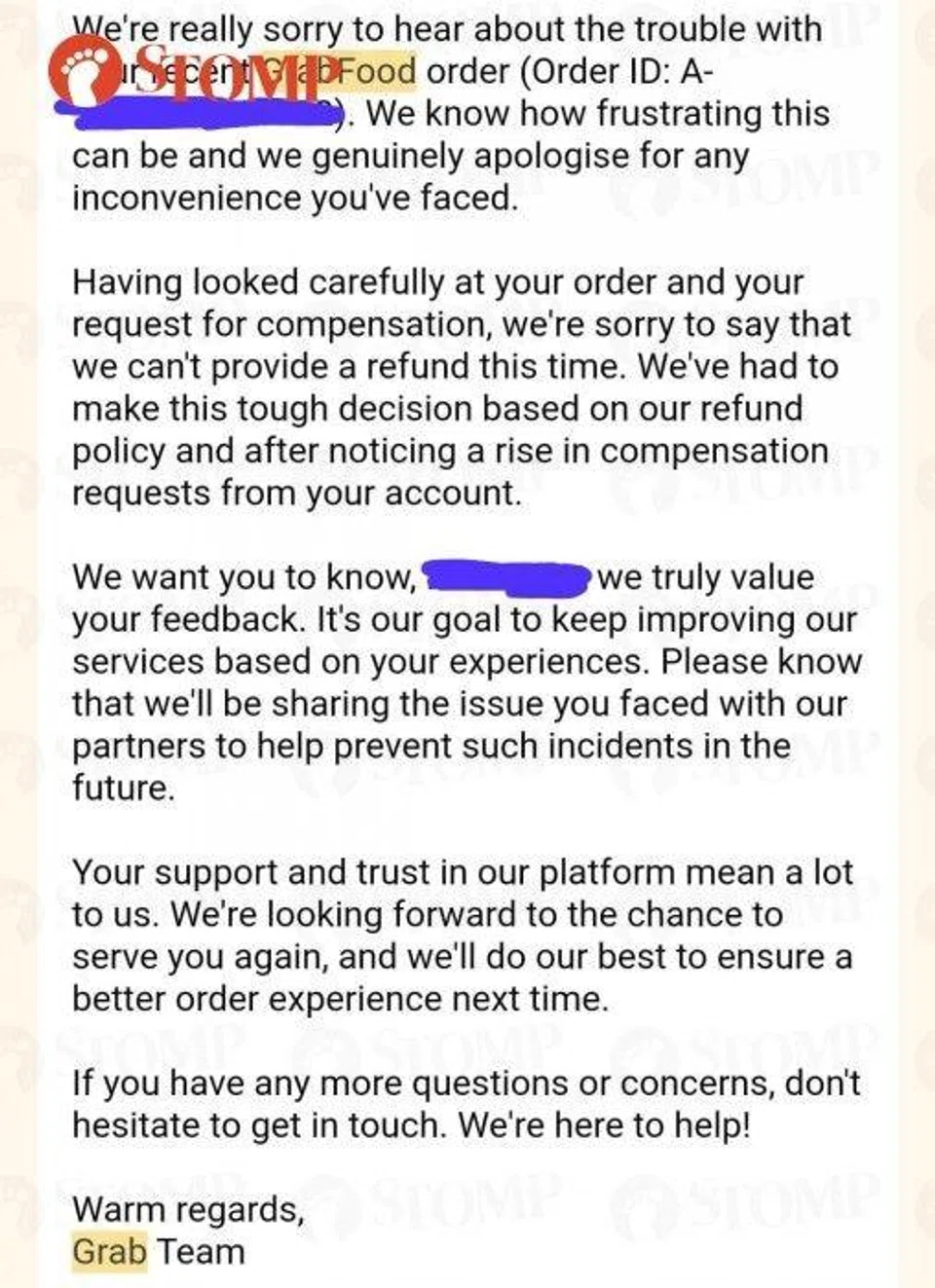 GrabUnlimited customer can't get refund for wrong orders due to her 'rise in compensation requests'