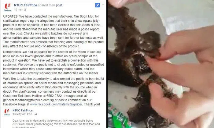 NTUC FairPrice has posted a response to a viral video on its Facebook page, stating that the manufacturer has clarified that grass jelly seen in the clip is not made of plastic.