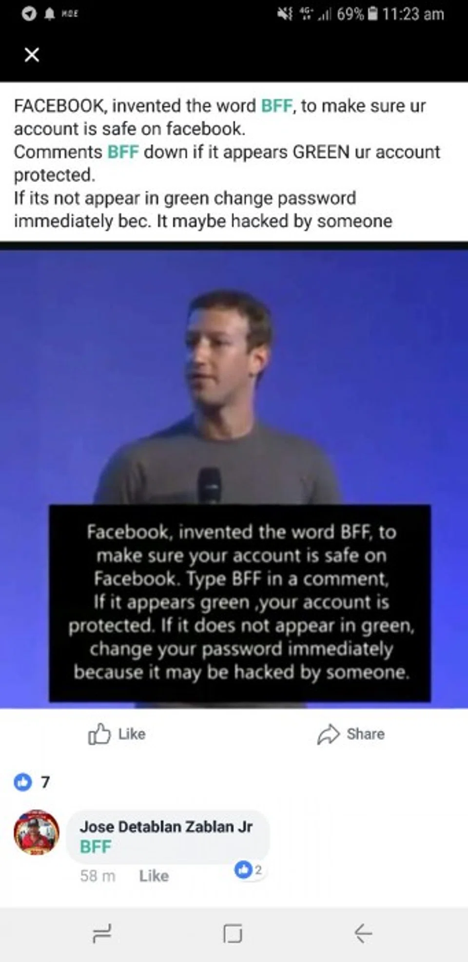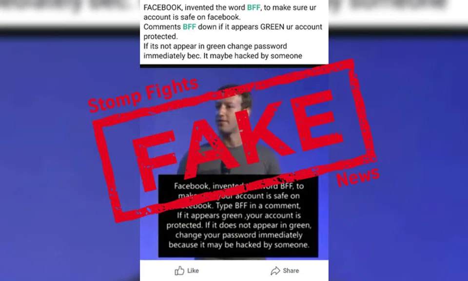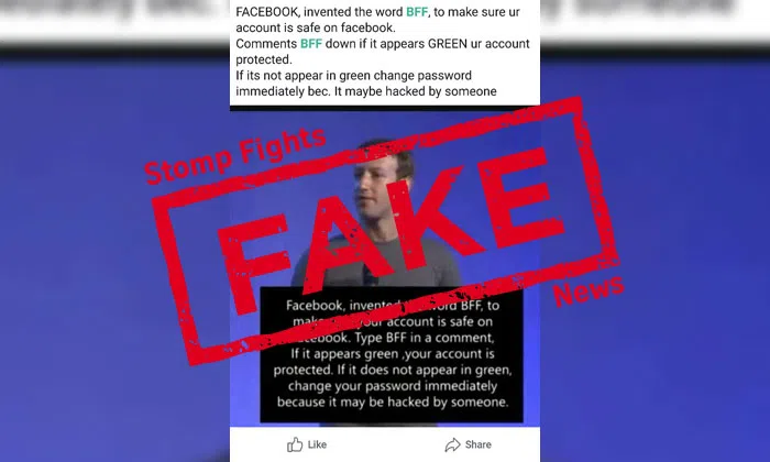 The lie says that if you type "BFF" in a comment on a Facebook post and if it appears green, your account is allegedly protected.