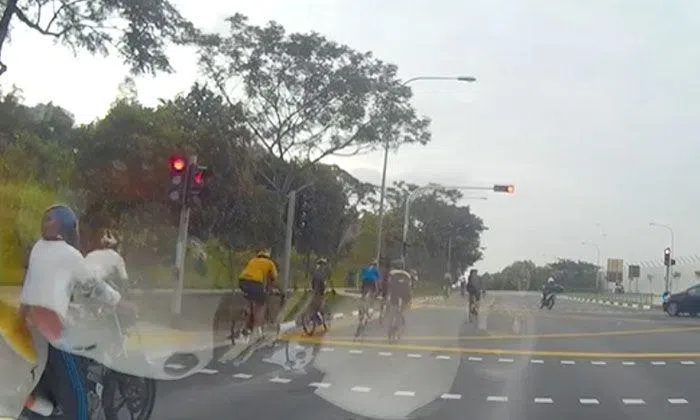 In a video posted by Andy Goh on SG Road Vigilante's Facebook page, a group of cyclists is seen riding in the leftmost lane of a three-lane road.