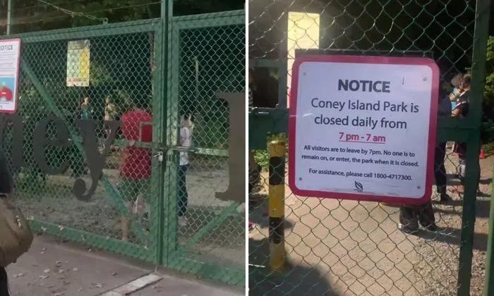 The video also cuts to a shot of a signboard on the gate, stating that Coney Island is closed from 7pm to 7am daily.