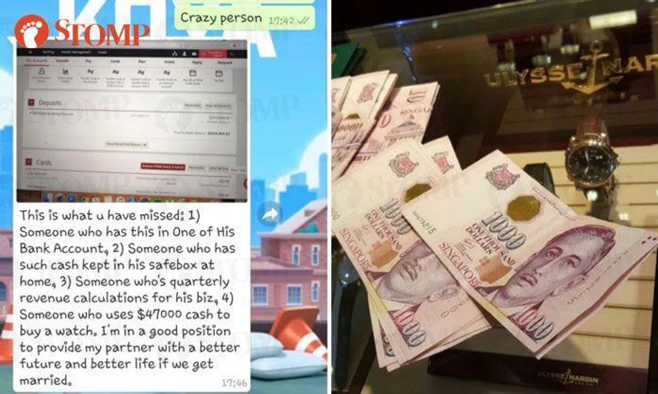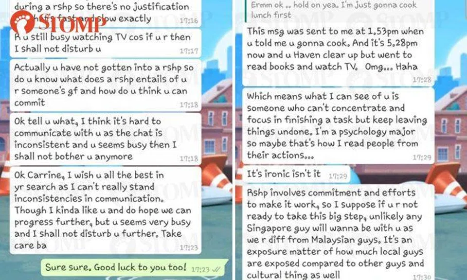 In screenshots Carrine shared with Stomp, the man appears to suggest that he will stop bothering her after she tells him to take it slow, saying that he can't stand "inconsistencies in communication".