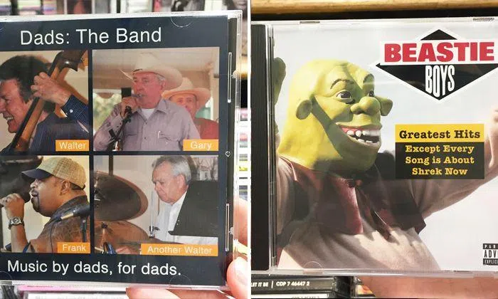 Perhaps his best plant to date is sneaking a bunch of fake CDs with hilarious, dubious titles such as Frank Sinatra Makes 23 Train Noises, Dads: The Band – Music By Dads For Dads, and Songs To Drive Off A Cliff To Volume 3, into a Los Angeles music store.