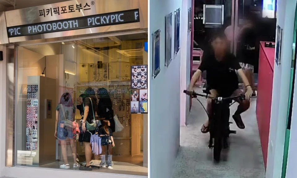 .The store, PickyPic Photobooth, shared surveillance footage of the incident on Oct 24, showing the rider later trying to rub away a skid mark with his slipper before the group posed for selfies.