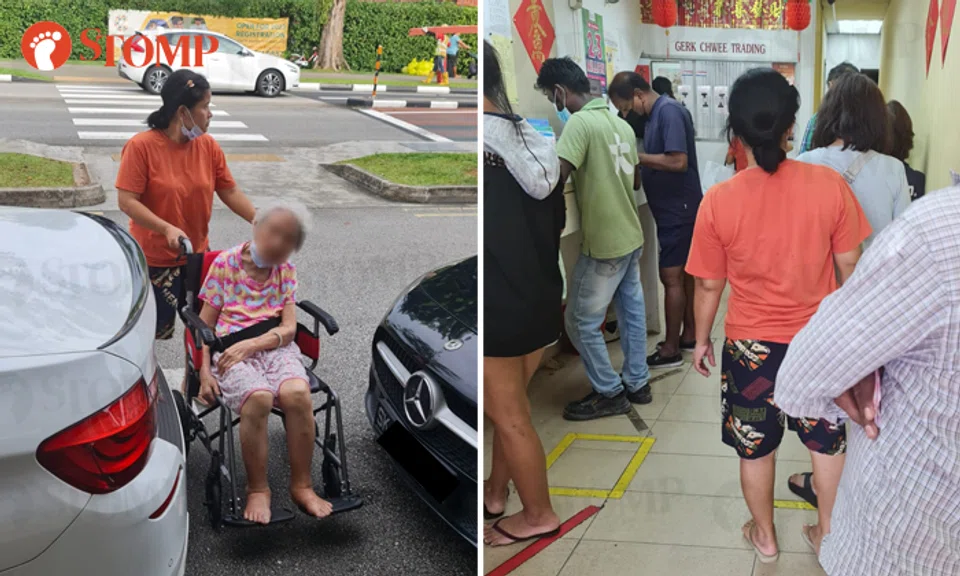 Photos show the elderly woman left in between two parked cars while the helper was in the queue at a Gerk Chwee Trading (an authorised retailer of Singapore Pools) outlet.