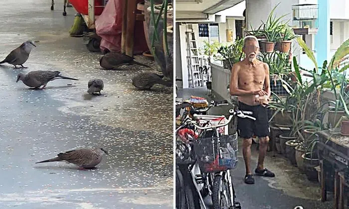 The man is said to live alone on the 9th floor of Block 463 Ang Mo Kio Avenue 10. When Shin Min visited the area, rice grains were scattered outside the man's unit, with pigeons and sparrows pecking at the ground.
