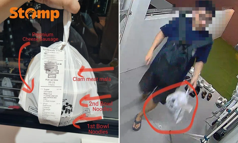 Photos shared with Stomp show the packed order in a plastic bag before it was collected as well as a screenshot of the customer walking away with the food items.