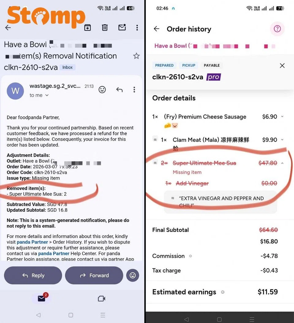 However, the customer later reported to Foodpanda that the two bowls of noodles amounting to $47.80 were missing from the order.