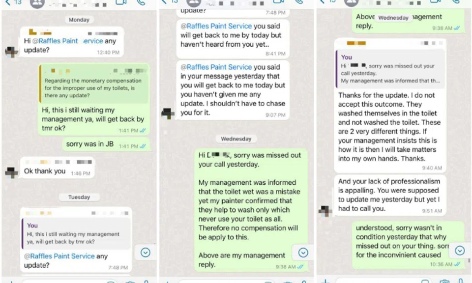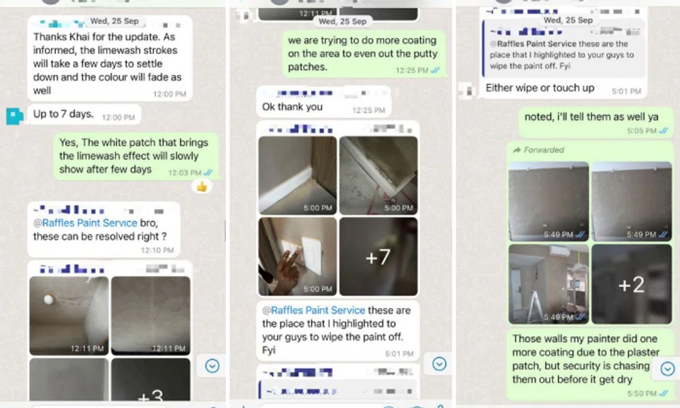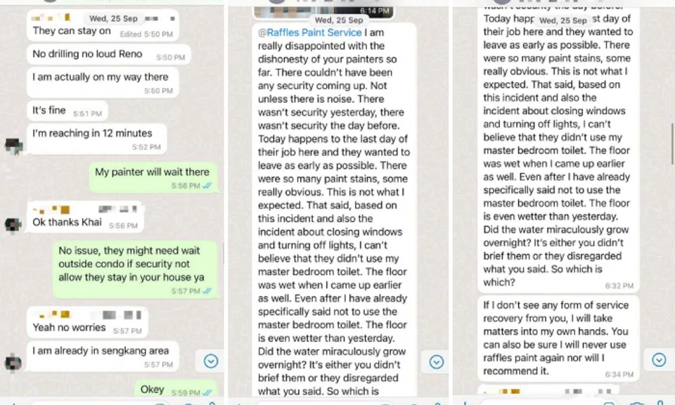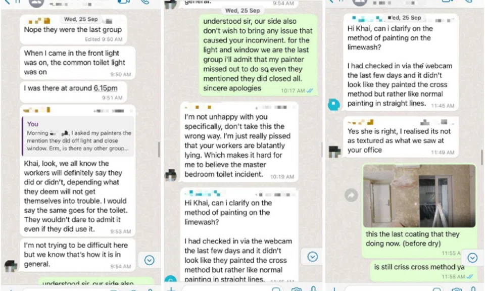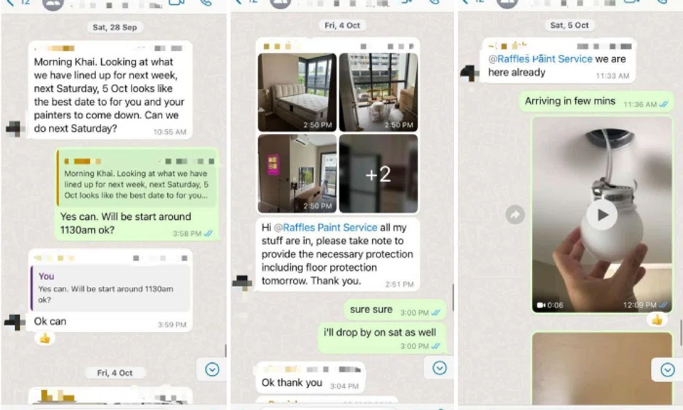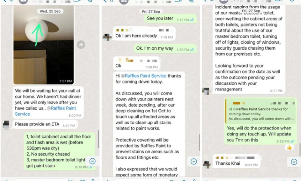 Khai told Stomp: "On Oct 5, we arranged a touch up appointment with Mr Derrick. I went down personally to check and clean off paint stains on lights and walls with no damage. As shown in the conversation above, we did share a video to prove that there was no damage and all has been cleaned.