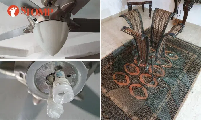 "We rushed downstairs and found our fan glass light cover had crashed and smashed our glass dining table. Glass was all over the table leg and chair on my carpet.