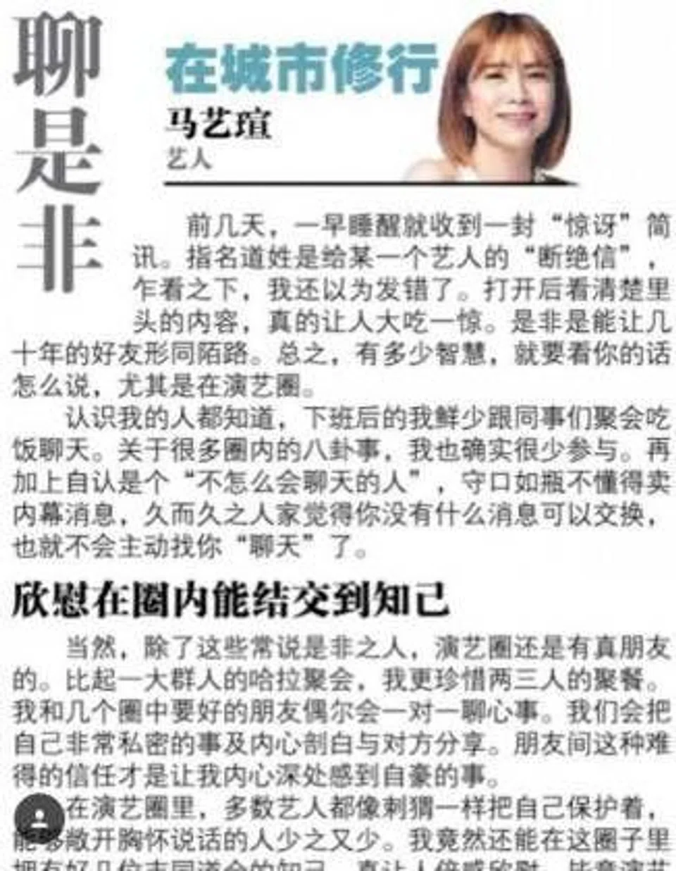 Wrote former Mediacorp actress Sora Ma in a Lianhe Wanbao column on Saturday (July 21):