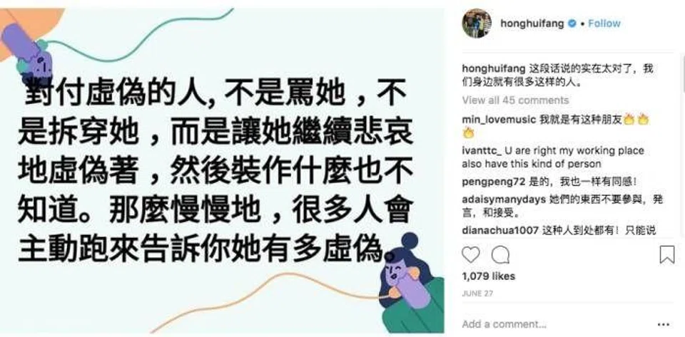 The decision to end the relationship comes as the last resort after she finally had enough, said Hong in her message. Mutual friends, such as Vivian Lai, Chen Xiuhuan and Chen Hanwei also reportedly received the message, reports Shin Min Daily News.