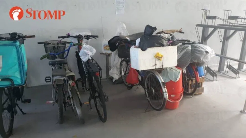 In a photo taken on Oct 1 by Stomper John, items, including styrofoam boxes, plastic bags, buckets, and other personal belongings, were stacked around some bicycles.
