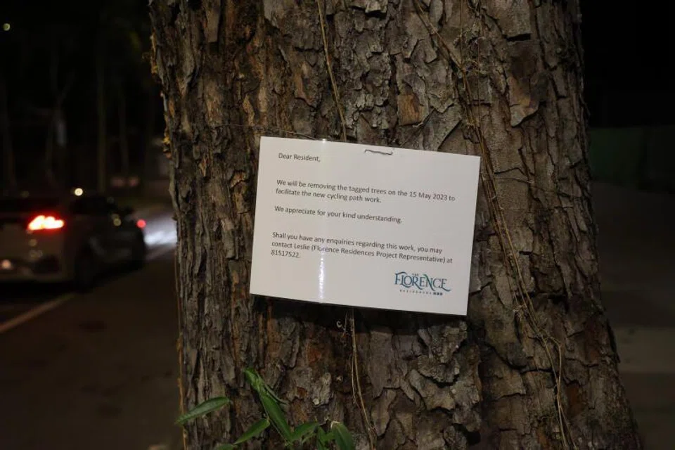 In the post, one of the trees had a sign pinned on it by the developers of Florence Residences, informing residents that the trees would be removed to make space for a cycling path.