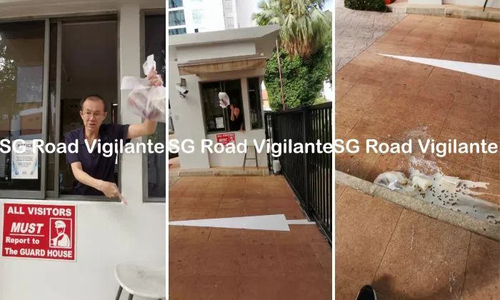 A condominium security guard threw a bubble tea order to the ground after warning a food delivery rider not to leave the drinks at the guard house.