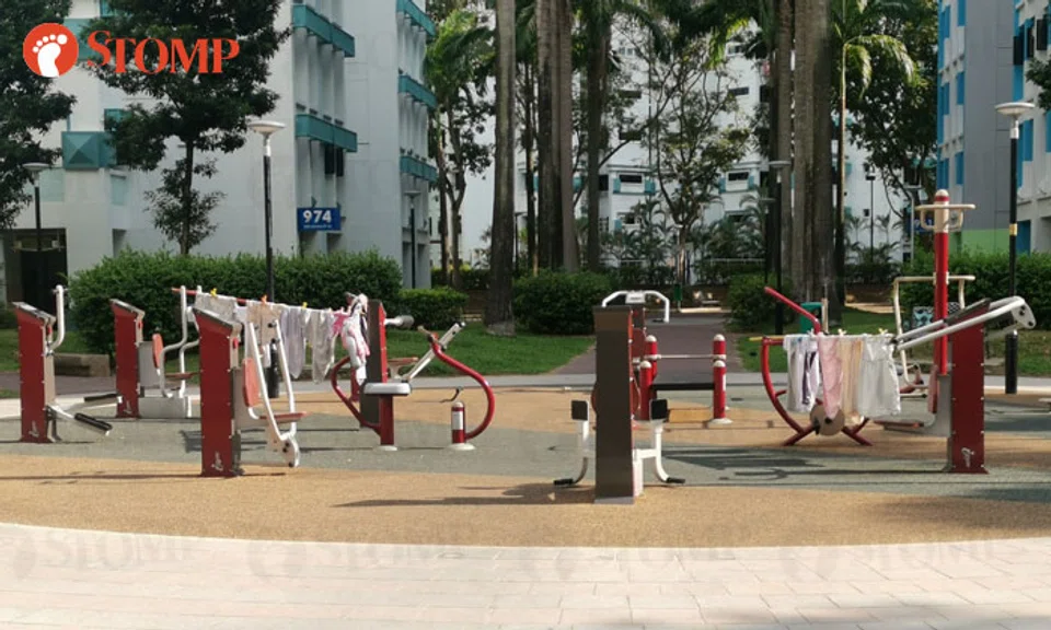One Hougang Avenue 9 resident decided to 'conquer' the situation by hanging her laundry at a fitness corner near Block 974.