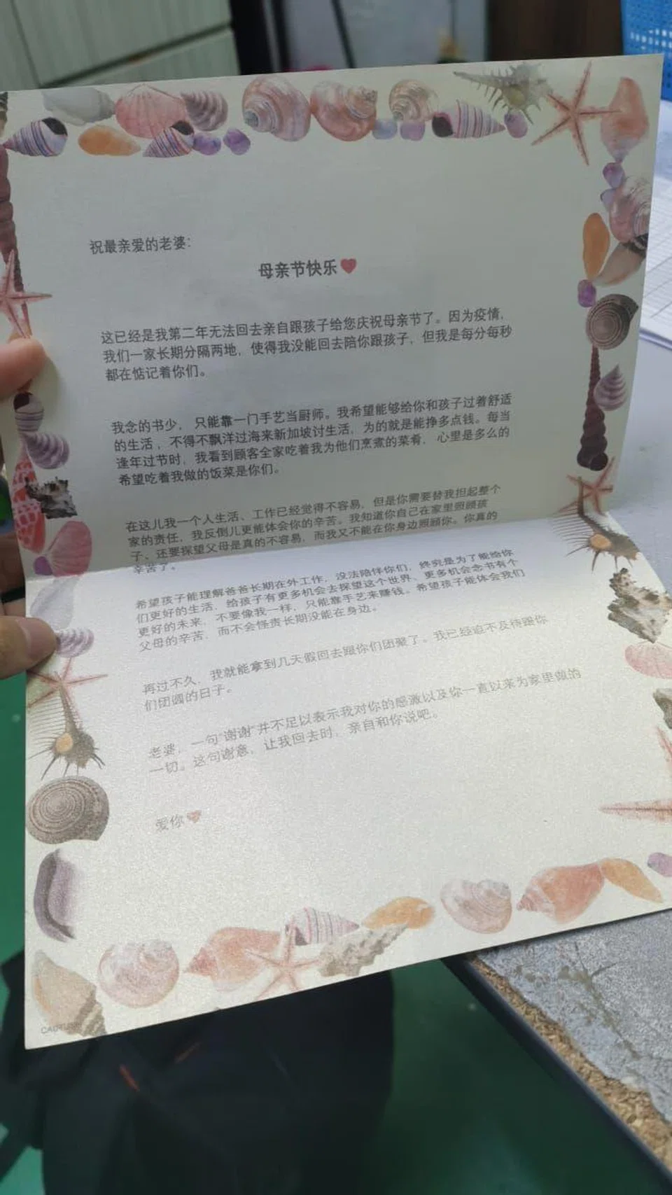 To my dearest wife: Happy Mother's Day. This is the second year that I can't go back and celebrate Mother's Day with my kids in person. Because of the epidemic, our family has been separated for a long time, so I can't go back to accompany you and the children, but I am thinking of you every minute. I read few books and can only rely on one craft to be a cook. I hope to be able to live a comfortable life for you and your children, and have to travel across the ocean to Singapore to seek a living, just to earn more money. Whenever it's a New Year's holiday, I see the whole family of customers eating the dishes I cook for them, and I hope that it's you who eat the dishes I cook. It is not easy for me to live and work alone here, but you need to take the responsibility of the whole family for me, but I can understand your hard work better. I know it's really hard for you to take care of your children at home and visit your parents, and I can't be there to take care of you. You have worked really hard. I hope that the children can understand that the father has been working outside for a long time and cannot accompany you. After all, it is to give you a better life, to give the children more opportunities to visit the world, more opportunities to study and have a better future. Don’t be like me The same, can only rely on craftsmanship to make money. I hope that children can appreciate the hardships of our parents and not blame them for not being around for a long time. Soon, I'll be able to get a few days off and go back to join you. I can't wait for the day to be reunited with you. Wife, a "thank you" is not enough to express how grateful I am to you and all that you have been doing for the family. This thank you, let me tell you in person when I go back. love you Love you.