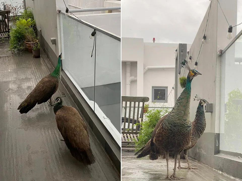 A couple living in the penthouse of a condominium in Balestier found themselves the unexpected hosts to two colourful peafowls that made their way up the 16th-floor unit on Nov 27.