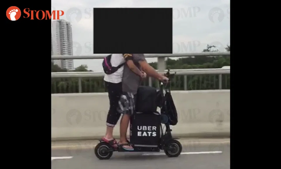 Stomper Michelle was concerned to see a couple, who were apparently delivering food for UberEATS, sharing an electronic scooter along Bedok South Avenue 1.