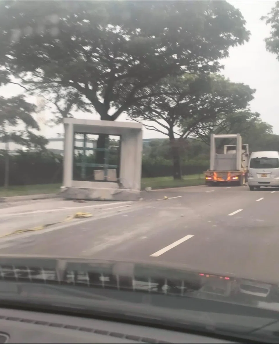 Stomper Jane alerted Stomp to a photo circulating online of the concrete block, likely for prefabricated prefinished volumetric construction used in building Housing Board flats, sitting on the road many metres behind the trailer.