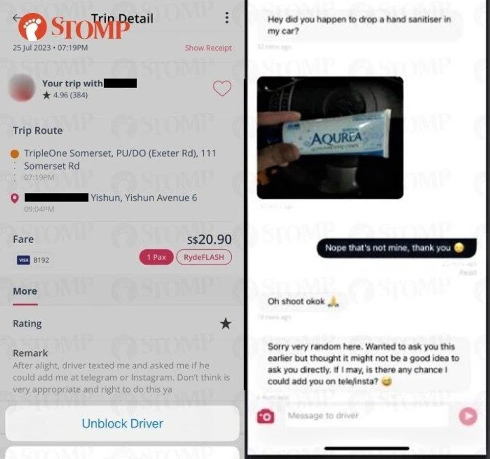 "She started the ride at 7.19pm and reached home at 7.57pm, but the driver only chose to end the trip at 9:04pm, using the Ryde chat to hit on my wife," said the Stomper.