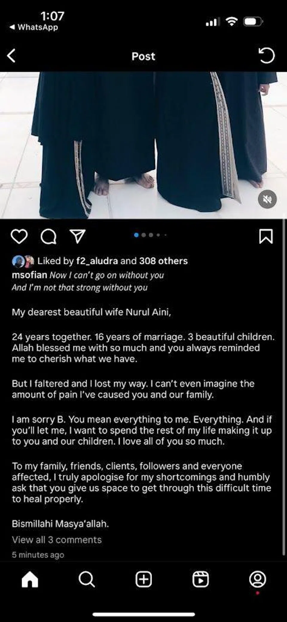 Sofian, a property agent with ERA Realty Network, admitted to his infidelity. He posted on Instagram a note addressed to his "beautiful wife" of 24 years.