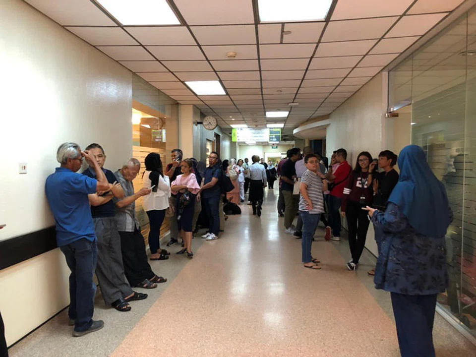 At the SGH at 3pm yesterday, about 50 relatives and friends, many of them distraught, gathered outside the intensive care unit .