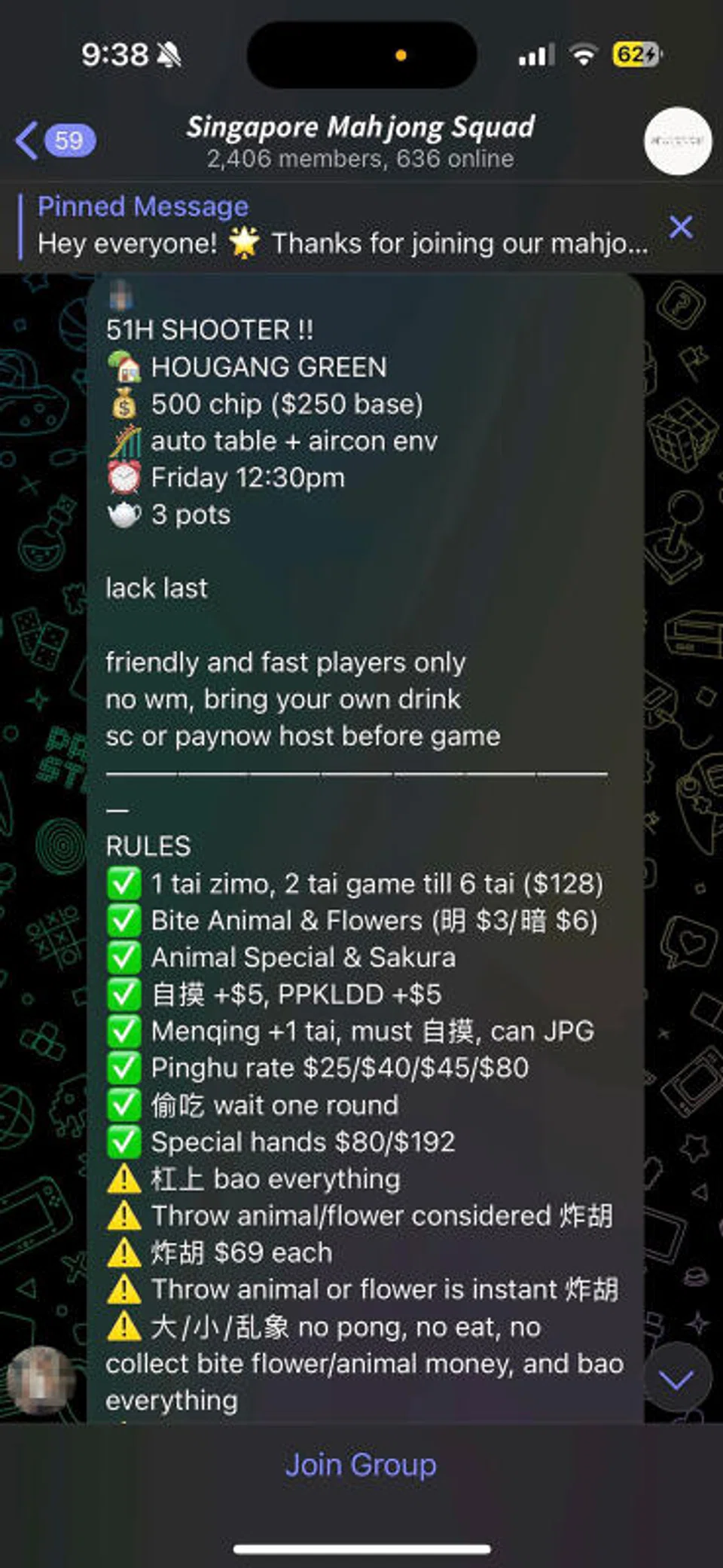 Touting their games as the "cheapest in Singapore", the buy-in fees for the mahjong games are advertised to be around $6 per person per hour, with discounts offered for gamblers who play for at least four hours.