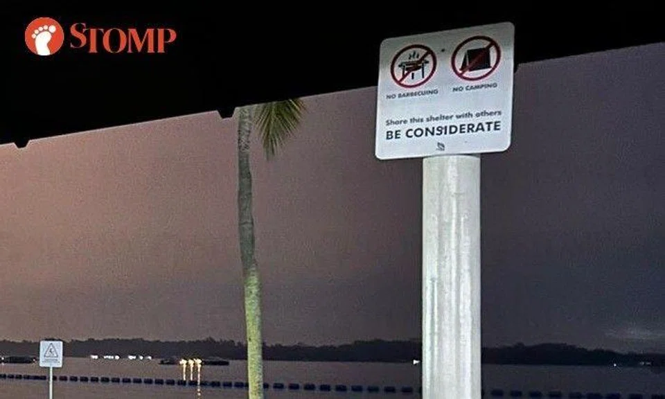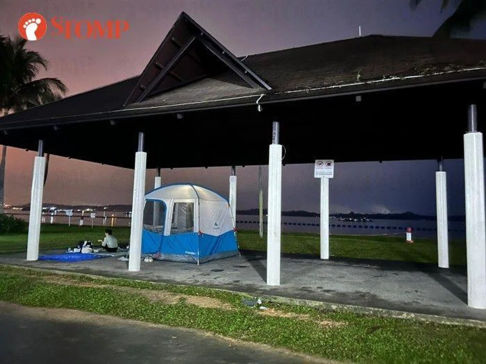 Inconsiderate family sets up camping tent inside Pasir Ris Park shelter where sign says no camping