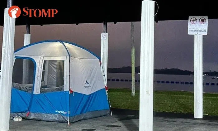 A Stomper is upset that someone had set up a six-person Quechua camping tent from Decathlon in the Pasir Ris Park shelter where camping was expressly prohibited.