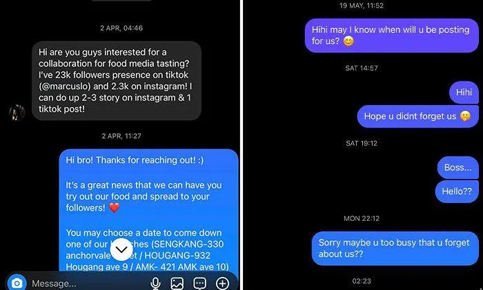 One influencer reached out to a local Thai restaurant on Apr 2, asking if they would be interested in collaborating for a food media tasting.