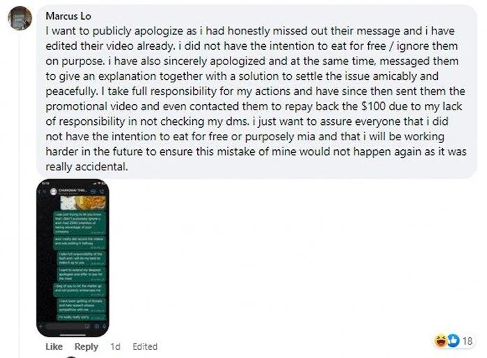 The influencer then arranged to visit the eatery on Apr 29 for dinner with his party but subsequently went MIA.