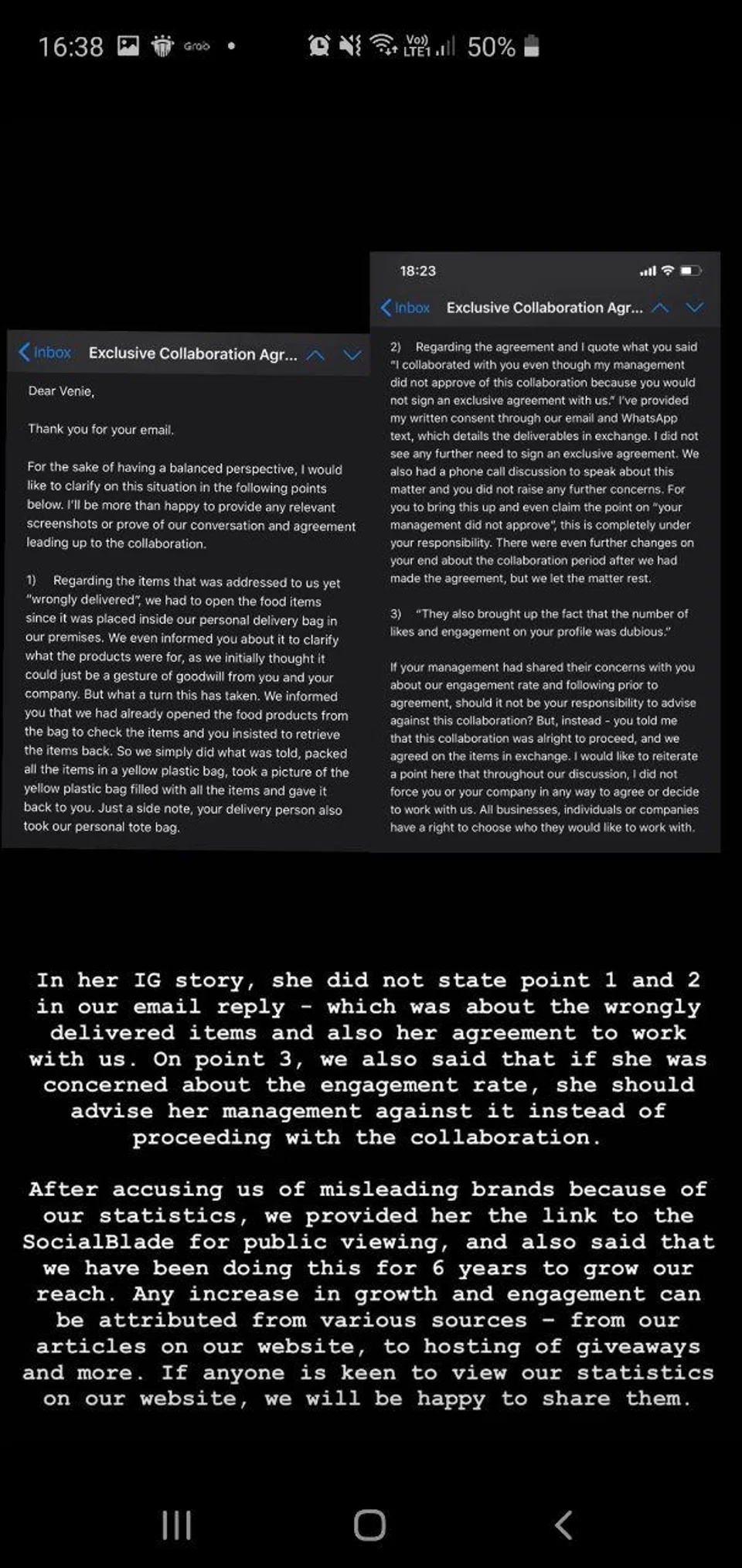 She said that if Venie was concerned about the statistics like the engagement rate of AAWF, she should have brought it up to her management instead of proceeding with the collaboration.