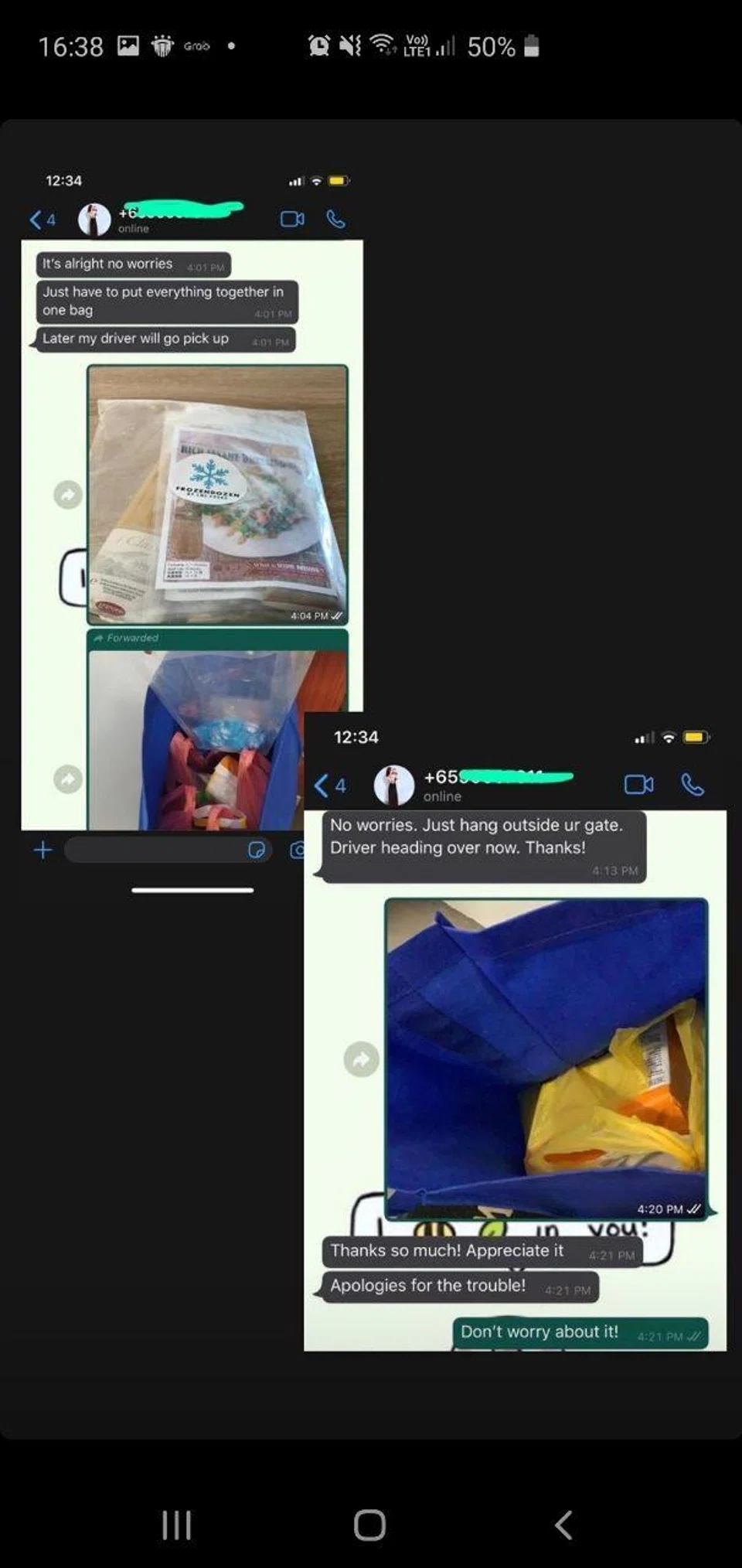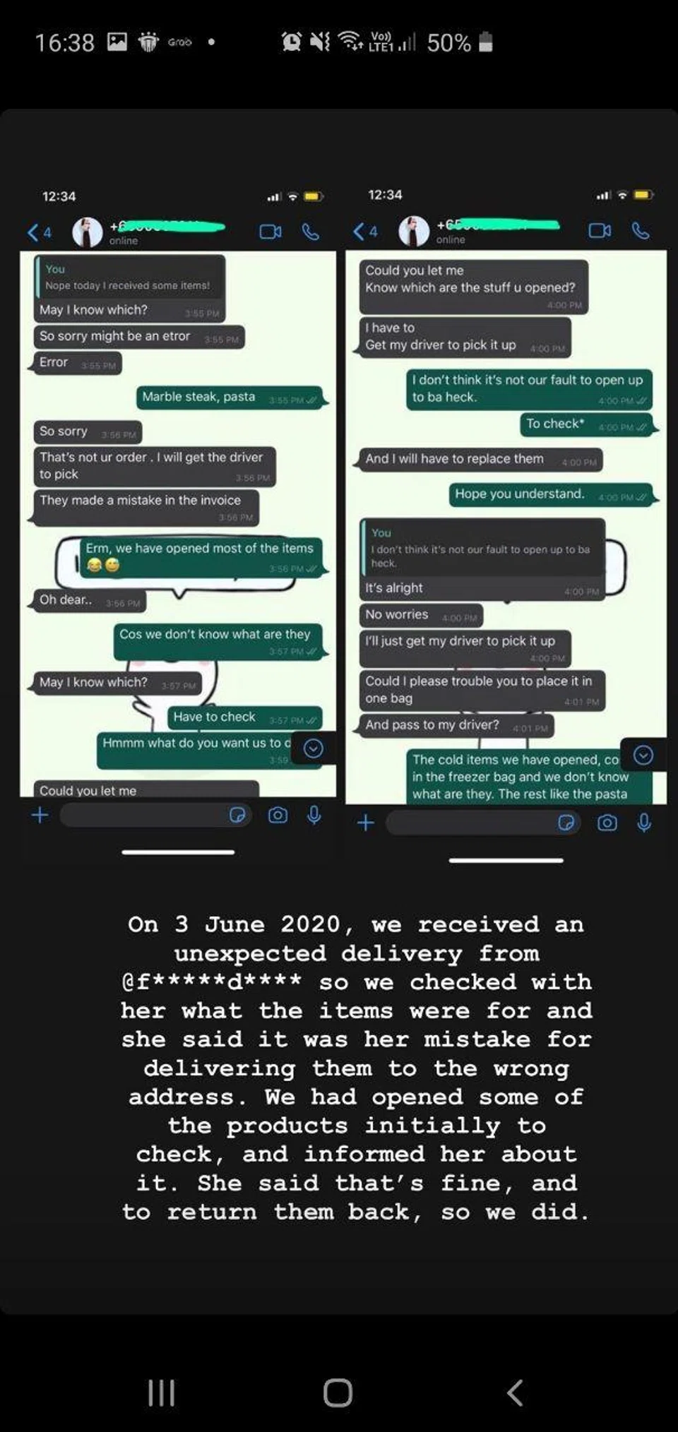 Venie admitted it was a mistake on their part and requested for her to put the items back in the cooler bag for a driver to pick up.
