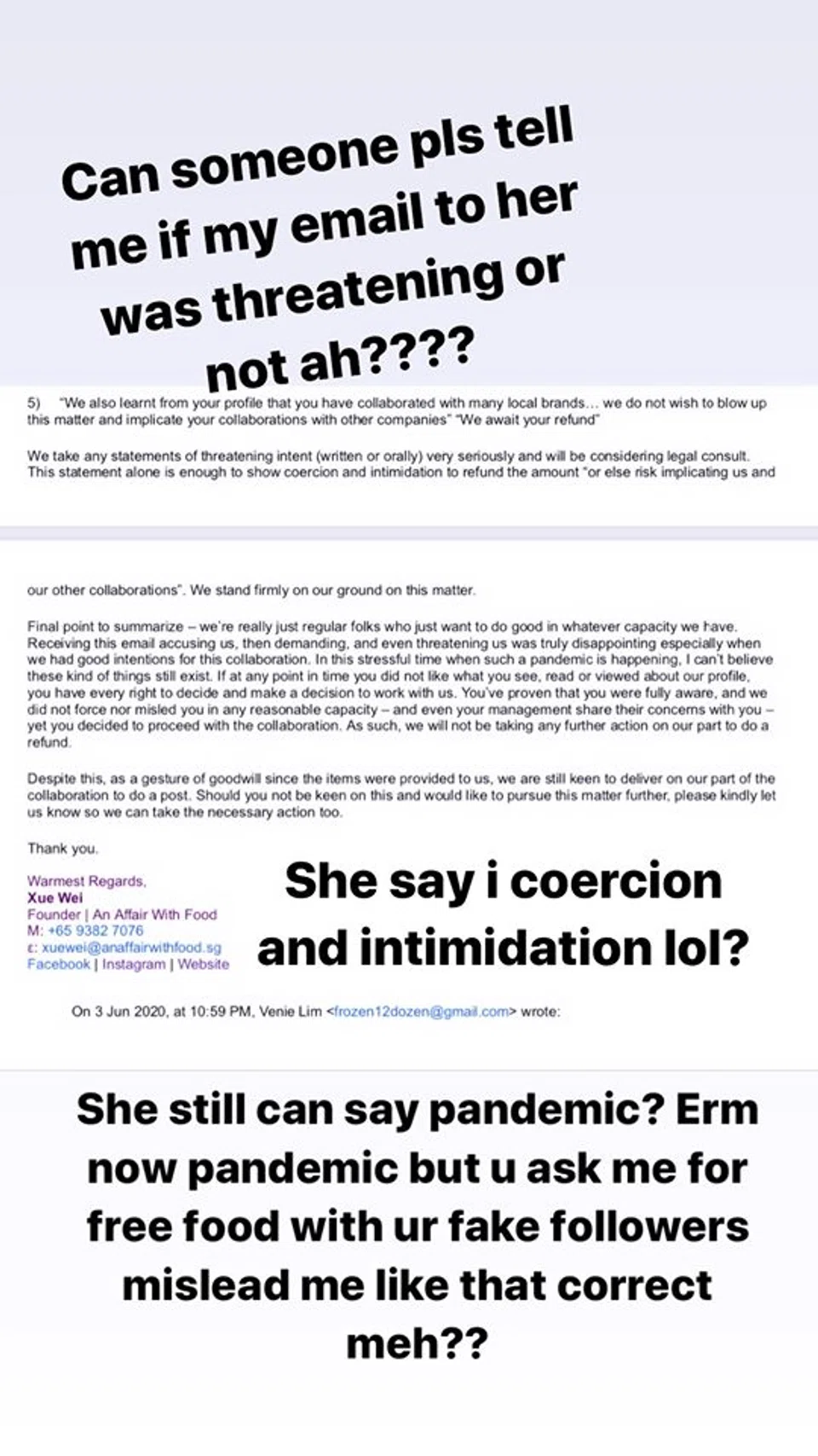In her email, Xue Wei of AAWF said that it took Venie's statement of not wanting to blow up the matter and to implicate their collaborations with other companies to be of "threatening intent".