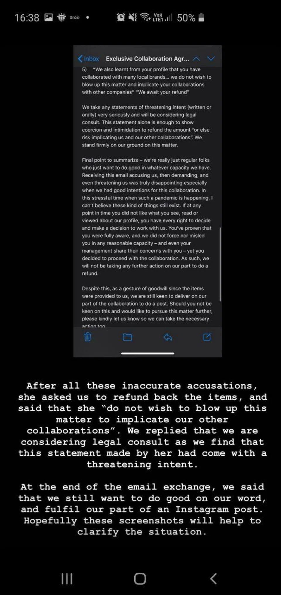 At the end of the email exchange, she said that they would like to fulfil their part of an Instagram post to "do good on our word".