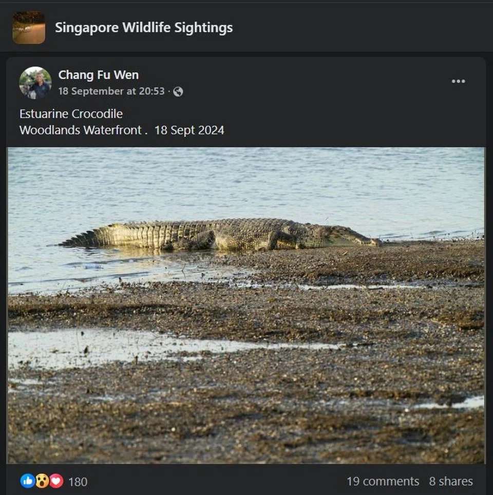 A photo of a crocodile at Woodlands Waterfront Park was also taken on the same day and posted in the Singapore Wildlife Sightings Facebook group.