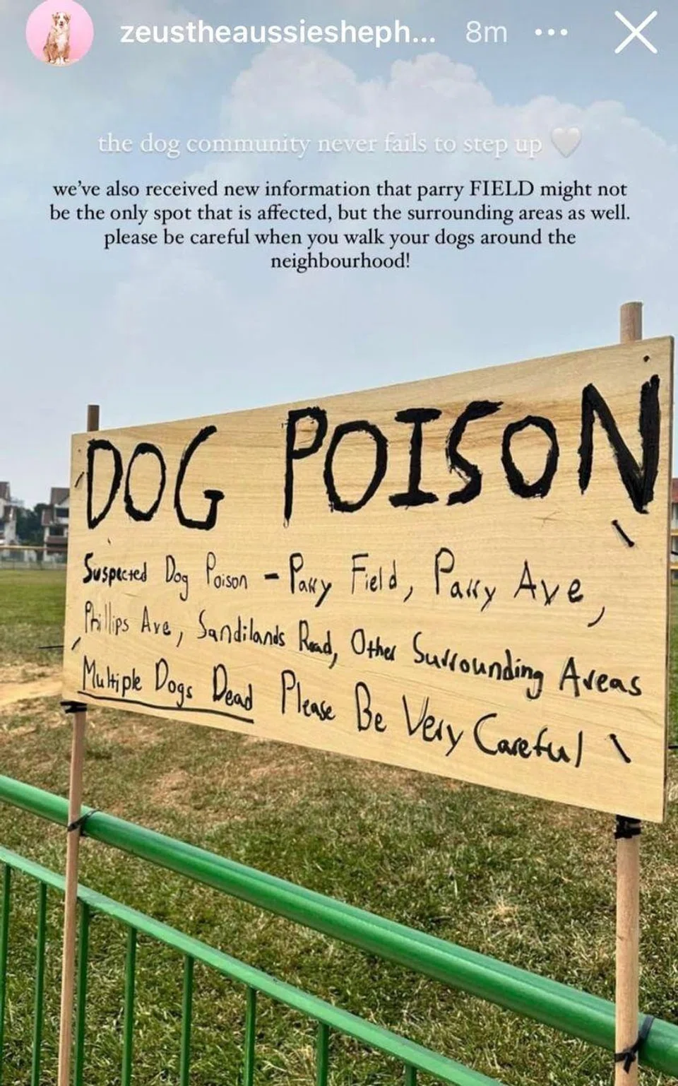 The sign alleges that there have been suspected poisoning cases not only at Parry Field, but also in the surrounding area, including Phillips Avenue and Sandilands Road.