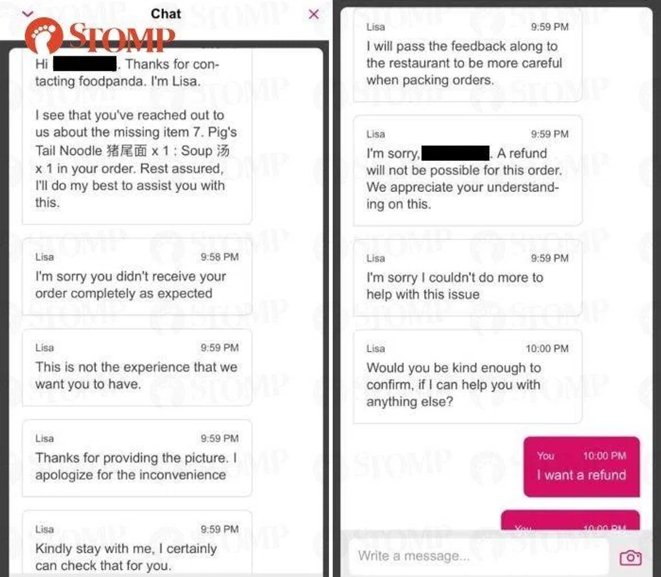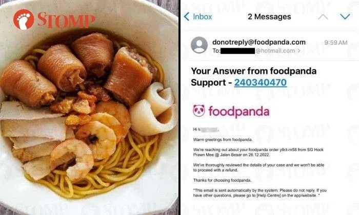 In response to a Stomp query, a Foodpanda spokesman said: "Our customer service team has reached out to the customer to provide assistance and resolve the issue."