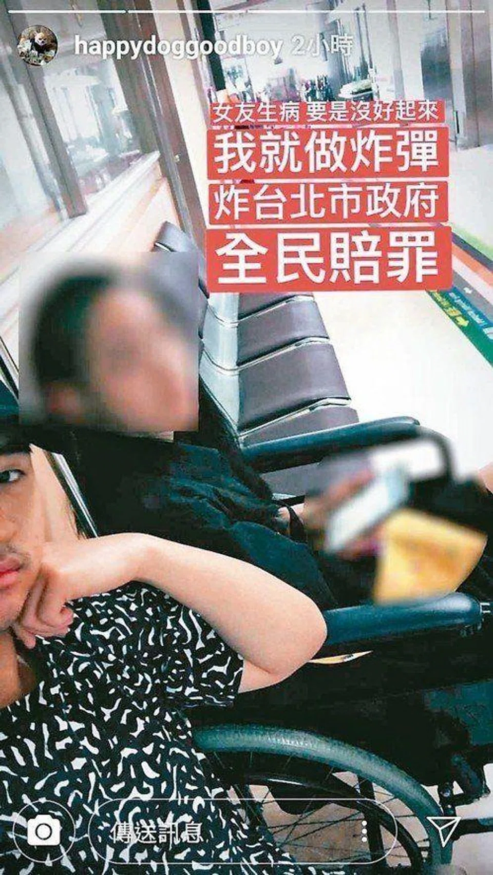 In a recent Instagram story, he wrote: "If my girlfriend doesn't recover from her illness, I will make a bomb and blow up the Taipei city hall. I'll make everyone pay."
