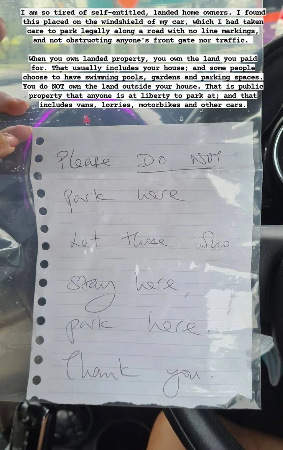 Seah wrote: "I found this placed on the windshield of my car, which I had taken care to park legally along a road with no line markings, and not obstructing anyone's front gate nor traffic."