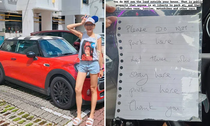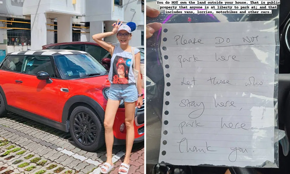 Local host Jade Seah has taken to Instagram to call out what she deemed "self-entitled behaviour", after finding a note on her car's windshield asking her not to park along the road in a private estate.