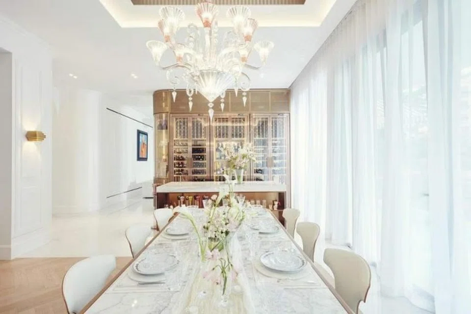 Adjacent to the eight-seater Giorgetti dining table set that is anchored by a Baccarat crystal chandelier hanging above, a wine chiller flaunts an impressive selection of vintages, including revered labels Chateau Mouton Rothschild, Petrus and Chateau Margaux.