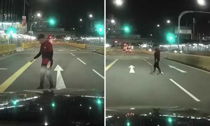 A jaywalker caught on video stopping in the middle of the road as a car bears down on him has drawn jeers from netizens, with many calling him a Kpod zombie.