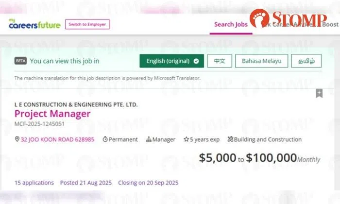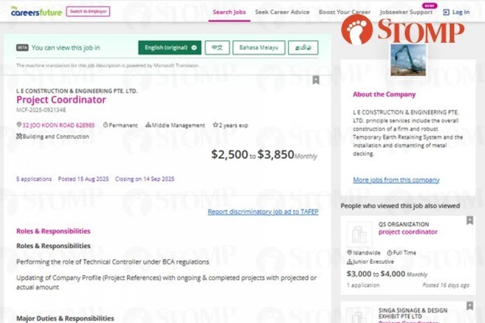 "Adding to the unease, according to the job advertisement posted on MyCareersFuture, the company is allegedly assigning project coordinators to serve as technical ontrollers - a designation governed by the Building and Construction Authority (BCA) under strict regulatory criteria," said the Stomper.
