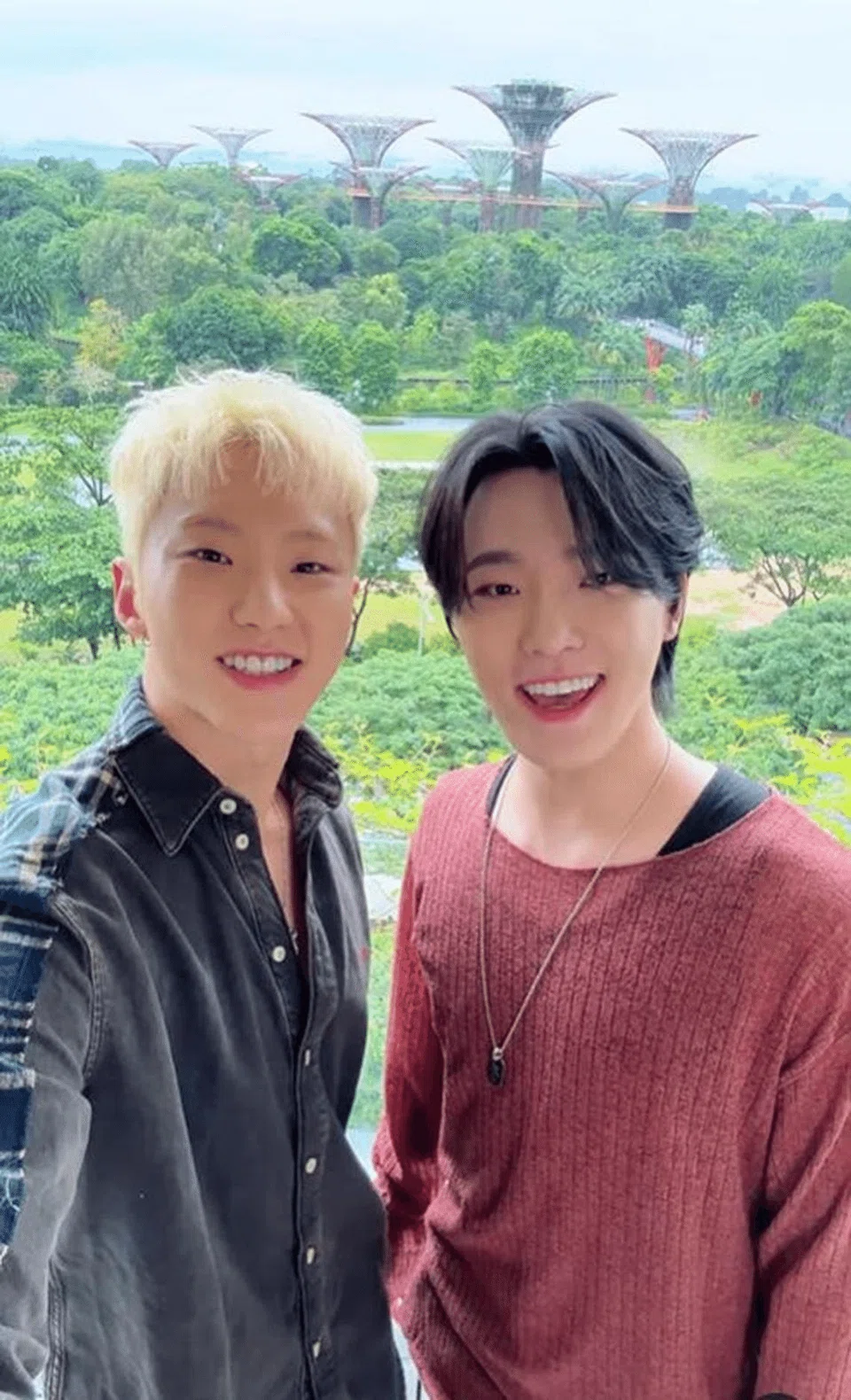 K-pop boy band Seventeen members Hoshi (left) and Dino introducing the view of Gardens by the Bay from the Marina Bay Sands hotel. PHOTO: SAYTHENAME_17/INSTAGRAM