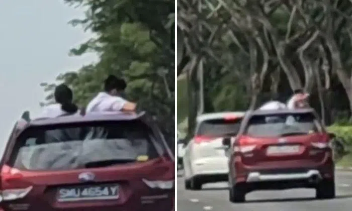 Two car passengers were spotted standing through the moonroof of a moving vehicle on the Kallang-Paya Lebar Expressway (KPE) on the morning of March 9.