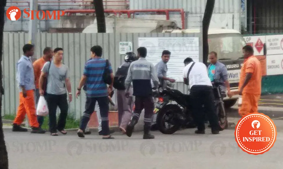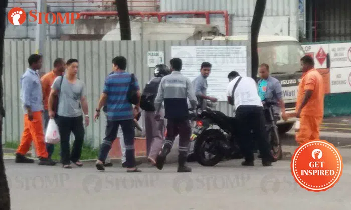 A group of workers, as well as Stomper Stone, rushed to help a biker who was involved in an accident along Tanjong Kling Road in Pioneer today (Sep 26) at around 7.30am.