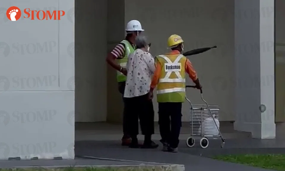 A pair of workers were seen going the extra mile to help an elderly woman in Hougang on Feb 5.
